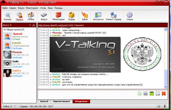 V-Talking 3.1.0.924 - многофункциональный чат и форум для локальных сетей с мониторингом сетевых подключений и шифрованием сообщений. V-Talking 3.1.0.924 может работать как в клиент-серверном режиме, так и в режиме клиент-клиент. Поддерживается администрирование, отложенные сообщения, передача файлов, система репутации, информация о пользователях, сетевое окружение, аккаунты, аватары, скины и многое другое.