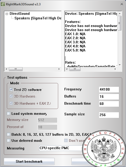 Утилита RightMark 3DSound позволяет протестировать качество звуковой карты и узнать, какие технологии она поддерживает. Данный тестовый пакет ориентирован на проведение комплексного синтетического теста звуковой карты, аппаратных возможностей, а также качество поддержки на программном уровне устройств DirectSound. Пакет содержит три теста: RightMark 3DSound Positioning Accuracy test (тест на точность позиционирования), RightMark 3DSound CPU Utilization test (тест нагрузки на процессор) и RightMark 3DSound Data Analyzer (анализ данных).