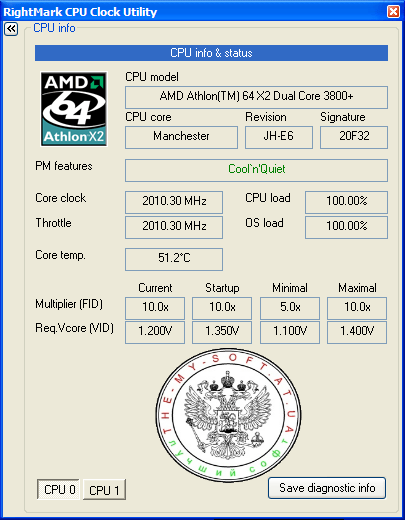 Программа RightMark CPU Clock Utility предназначена для мониторинга частоты и уровня загрузки центрального процессора в реальном времени. Программа следит за работой процессоров (настольных, серверных и мобильных версий), произведенных компаниями Intel и AMD. Приложение может работать и с многопроцессорными системами. В последнем случае она ведется независимый мониторинг для каждого процессора и позволяет управлять их параметрами по отдельности. Частота и загрузка процессора отображается в виде графика. Всю полученную информацию можно сохранить в текстовый файл. Кроме того, программа позволяет управлять режимом электропотребления, если процессор поддерживает эту функцию.