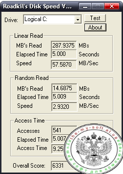 Утилита Roadkil's Disk Speed предназначена для тестирования скорости чтения любых имеющихся в системе дисков, в том числе дисковода и приводов компакт-дисков. Тестирование выбранного локального диска длится в среднем 15–30 секунд. За это время опрашивается диск, определяются скоростные параметры в режиме линейного и случайного чтения, и рассчитывается общее время доступа. Дополнительно утилита выводит информацию об общем объеме прочитанных в течение тестирования данных, времени анализа и скорости чтения.