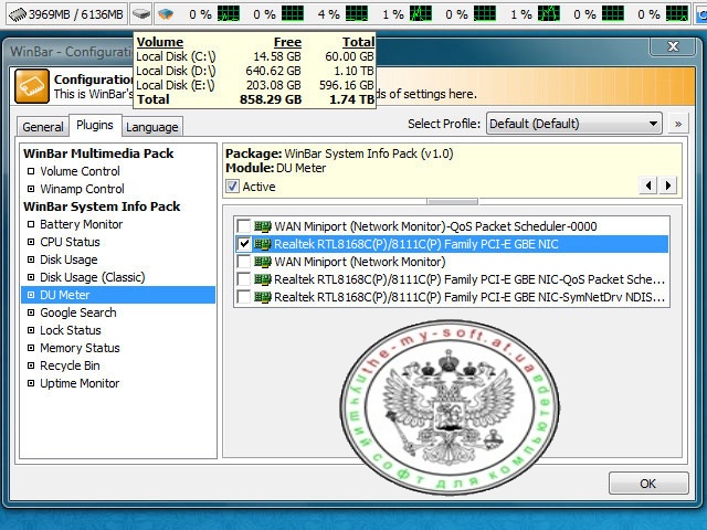 Довольно удобные возможности мониторинга предоставляет утилита WinBar. Интерфейс WinBar выполнен в виде горизонтальной панели (ее можно разместить вверху или внизу экрана), на которой отображается информация о различных процессах, происходящих в системе. Настроить показ сведений можно, выбрав в меню программы пункт Configuration. Откроется окно WinBar Configuration содержащее несколько вкладок: CPU Usage (содержит информацию о загрузке процессора), Disk Usage (содержит данные об использовании дискового пространства), Mem Usage (здесь отображаются данные об объеме общей и свободной оперативной памяти), Volume (здесь находятся данные о громкости), Resolution (содержит данные о текущем разрешении экрана) и т. д.