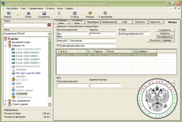 Простая и удобная утилита «База компьютеров организации» пригодится системным администраторам. Она предназначена для сбора информации обо всех имеющихся компьютерах в организации, установленном на них программном обеспечении, проведенных ремонтах комплектующих и контроля гарантийных сроков. Главная особенность программы — отсутствие необходимости вводить все данные вручную. Она позволяет импортировать созданные в программах Belarc Advisor и FreshDiagnose (см. выше) отчеты и рассортировать их по расположению компьютеров (технический отдел, бухгалтерия и т. д.). Утилита имеет собственные базы справочников комплектующих, программного обеспечения, поставщиков и т. п., которые можно изменять и дополнять новыми сведениями.