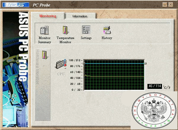 Программа ASUS Probe поставляется в комплекте с материнскими платами ASUS и предназначается для их мониторинга. Настройки программы собраны на шести вкладках: Temperature Monitor (показывает данные термодатчиков материнской платы в виде графиков), Fan Monitor (информация о скоростях вентиляторов, а также предельных значениях их вращения), Voltage Monitor (позволяет в реальном времени следить за напряжениями на процессоре, памяти, чипсете и графической шине), Monitor Summary (суммарная информация о температуре центрального процессора, материнской платы, скорости вентиляторов и напряжениях памяти, процессора и графической шины), Settings (позволяет отрегулировать предельные значения температуры, скоростей вращения вентиляторов и напряжений питания) и History (отчет по всем направлениям мониторинга, который доступен для сохранения в текстовый файл).