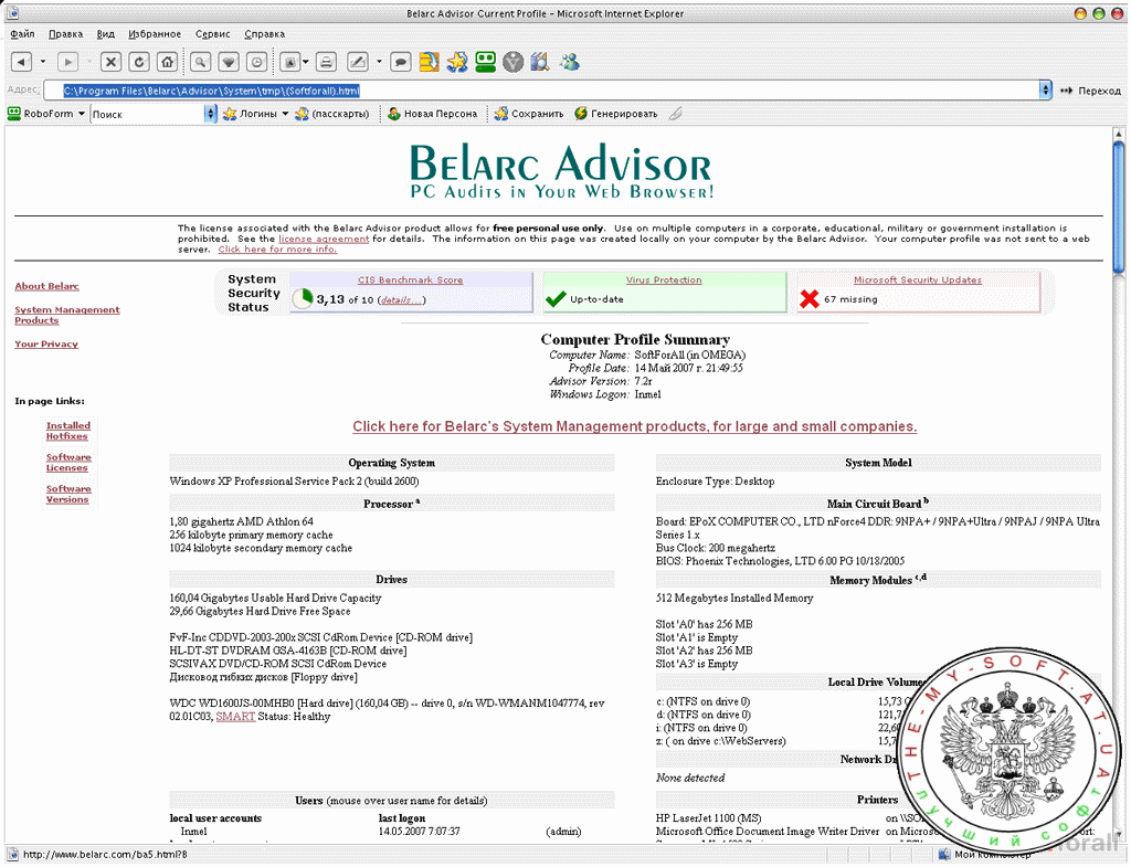 Не требовательная к системным ресурсам утилита Belarc Advisor позволяет за считанные секунды просканировать систему. На основе полученных данных Belarc Advisor генерирует HTML-файл, в котором представлены сведения обо всех компонентах компьютера: материнской плате, процессоре, модулях оперативной памяти, платах расширений, видеокарте, винчестере, приводах компакт-дисков и DVD и т. д. При этом утилита указывает полный объем имеющегося на момент сканирования системы свободного места на дисках.