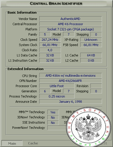 Утилита Central Brain Identifier предназначена для обладателей компьютеров на базе комплектующих AMD. Она позволяет получить максимальное количество сведений о процессорах данной компании. С помощью нее вы узнаете стандартные технические характеристики процессора (номинальную частоту, номер ревизии и кодовое имя ядра), получите информацию о технологическом процессе и маркировке. Central Brain Identifier также предоставляет сведения о кэш-памяти (1 и 2 уровней) и имеющихся мобильных функциях (для соответствующих версий процессоров). Любителям разгона утилита дает возможность поупражняться в управлении коррекцией кэш-памяти. На данный момент Central Brain Identifier обладает информацией о более чем 50 процессорах компании AMD.