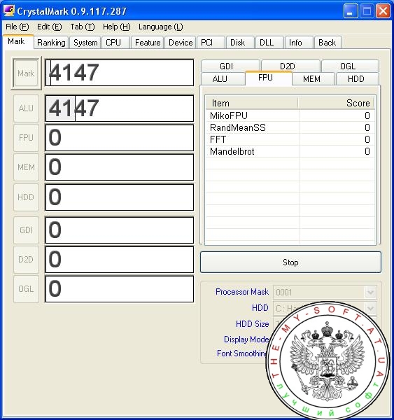 CrystalMark — небольшая, но достаточно функциональная тестовая утилита. Окно программы содержит несколько вкладок, предоставляющих полную информацию о процессоре, поддерживаемых технологиях, подключенных устройствах, жестком диске и другие полезные сведения. Программа имеет средства для максимально полной и объективной оценки производительности компьютера. С помощью CrystalMark можно протестировать работу центрального процессора (блоки ALU и FPU), оперативной памяти, подсистемы видеопамяти (GDI, DirectDraw и OpenGL), сетевых параметров и общих системных компонентов, включая жесткие диски.