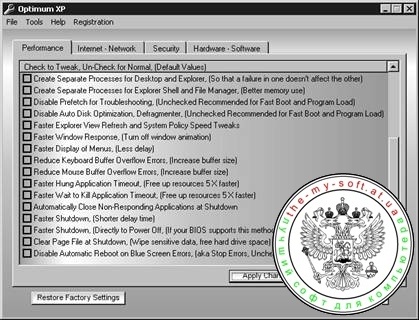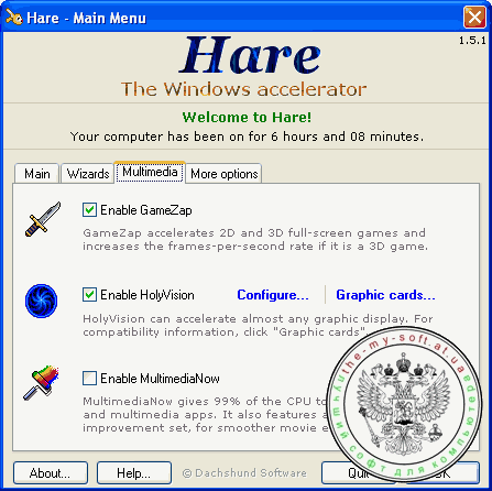 По утверждениям разработчиков, эта утилита может увеличить производительность операционной системы до 300 % за счет уникальной технологии интеллектуального распределения заданий главного процессора и буферизации данных. Чтобы оптимизировать работу компьютера, достаточно нажать кнопки Yes для параметров Enable Hare и Enable CPU Tasking. Работу с программой упрощают несколько пошаговых мастеров. Следуя их инструкциям, можно оптимизировать системный реестр и настроить систему на максимальное быстродействие.