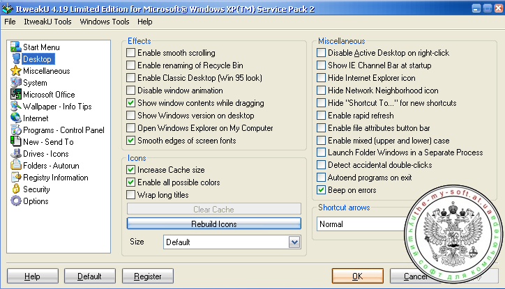 Окно программы ItweakU построено таким образом, чтобы пользователь мог одновременно применять как функциональные возможности ItweakU, так и стандартные средства для настройки Windows — Редактор реестра, управление с помощью командной строки и пр. Основные инструменты программы разделены на следующие группы: Start Menu (управление меню Пуск); Desktop (управление внешним видом Рабочего стола); Miscellaneous (управление списком команд контекстного меню, установка фонового рисунка для браузера Internet Explorer и пр.); System (автоматическое закрытие не отвечающих на запросы системы приложений, очистка файла подкачки перед выходом из системы, настройки безопасности); Wallpaper — Info Tips (настройки всплывающих подсказок и фонового рисунка Рабочего стола); Internet (параметры Internet Explorer и Outlook Express); Programs — Control Panel (корректное удаление из системы установленных приложений, а также скрытие различных элементов Панели управления); New — Send To (управление пунктом контекстного меню Отправить); Drives — Icons (выключение отображения дисков в окне Проводника и назначение им определенных значков); Folders — Autorun (управление списком приложений, которые загружаются вместе с операционной системой); Registry Information (системная информация о пользователе, хранящаяся в реестре); Security (настройки безопасности); Options (настройки самого оптимизатора).