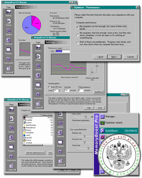 Утилита Memory Boost обладает расширенными возможностями улучшения работы оперативной памяти. Данная программа содержит оптимизирующие модули, позволяющие эффективно работать с физической памятью компьютера. Каждый модуль программы имеет отдельное окно с визуальным отображением настраиваемых параметров. Состояние системы показано с помощью диаграмм. Программа позволяет установить минимальное количество памяти, при достижении которого происходит автоматическая оптимизация; задать значения параметров оптимизации файловой системы и дискового кэша, исходя из назначения компьютера; очистить буфер обмена; задать количество необходимой свободной памяти после загрузки операционной системы; использовать центральный процессор во время очистки памяти (в режимах high, medium и low); настроить предупреждения о низком значении системных ресурсов раньше появления «синего экрана» (благодаря уникальному механизму Crash protect).