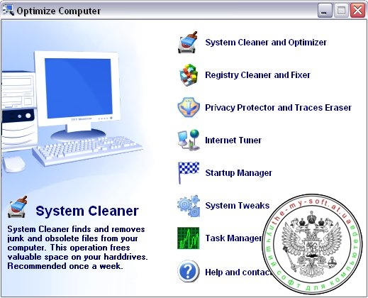 Данная программа представляет собой набор из семи утилит, помогающих очистить компьютер от «мусора», избежать многих ошибок и заставить его работать быстрее. Например, утилита System Cleaner and Optimizer находит старые и неиспользуемые файлы и удаляет их, в результате чего освобождается место на жестком диске и ускоряется работа компьютера в целом. Модуль Registry Cleaner and Fixer предназначен для исправления ошибок в реестре Windows, удаления неиспользуемых модулей и дефрагментации жесткого диска. Утилита Privacy Protector and Traces Eraser позволяет удалить все следы пребывания в Интернете, а именно файлы Сookies, адреса посещенных вами интернет-страниц, файлы истории и т. д.